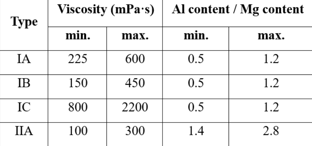 Các yêu cầu về độ nhớt và tỉ lệ magnesium và aluminum khác nhau giữa các loại magnesium aluminum silicate, như được trình bày trong bảng dưới đây:
